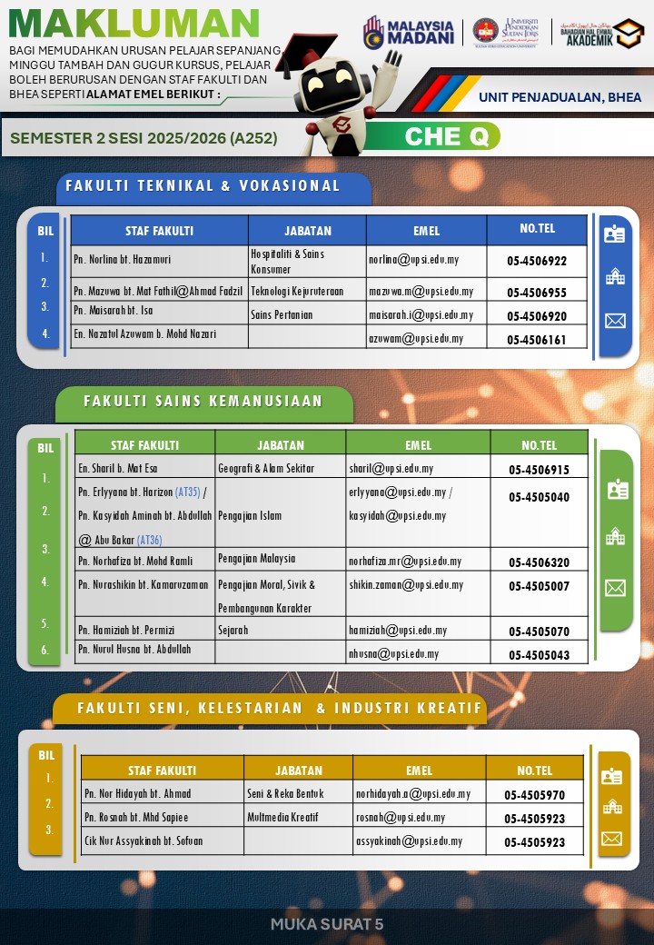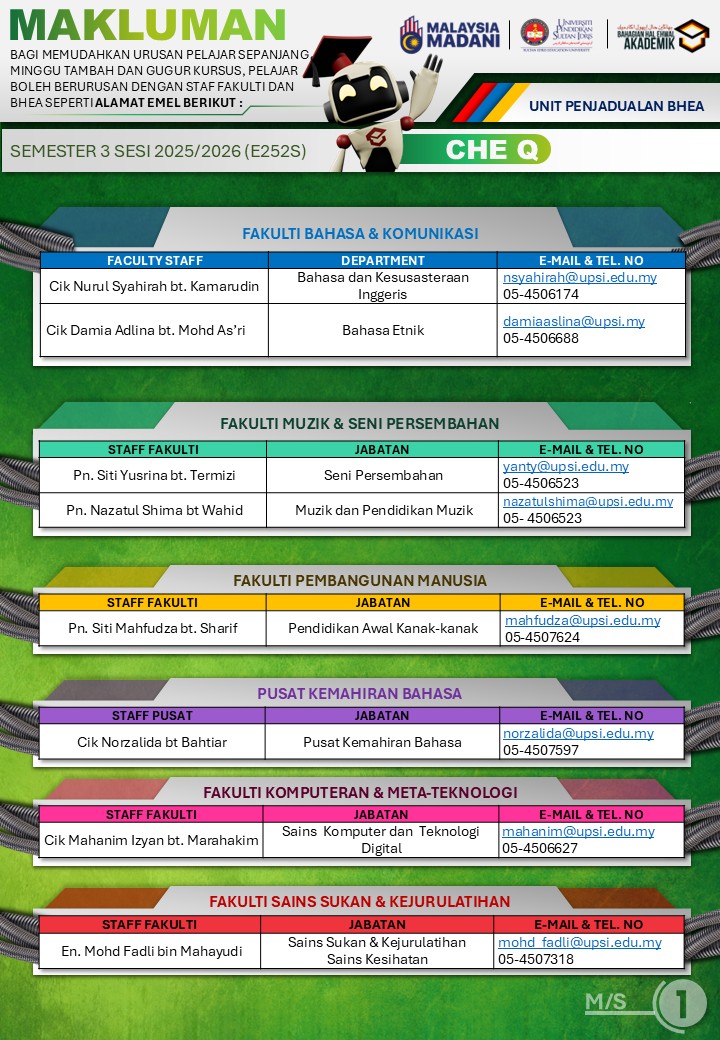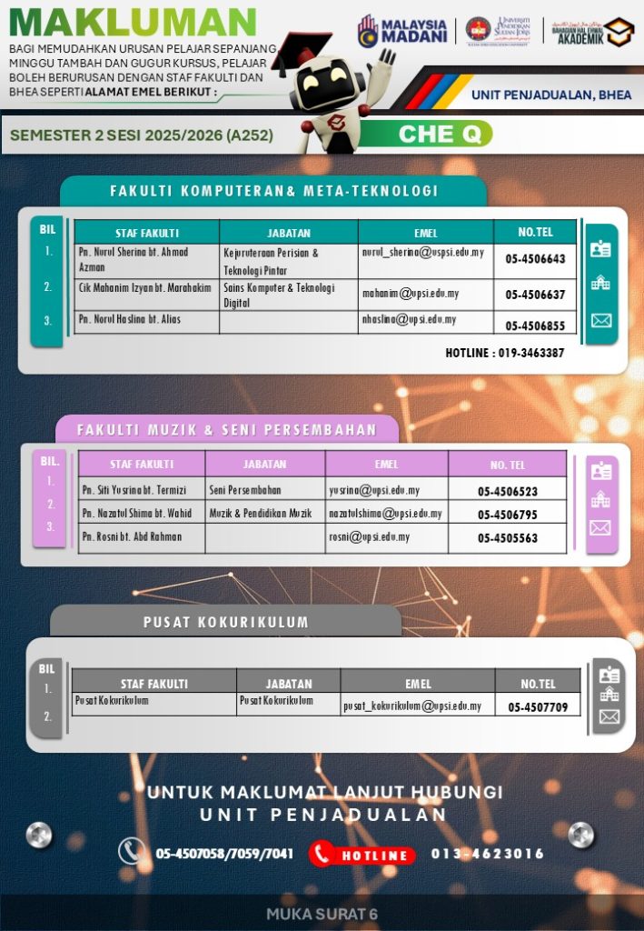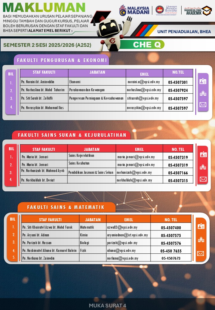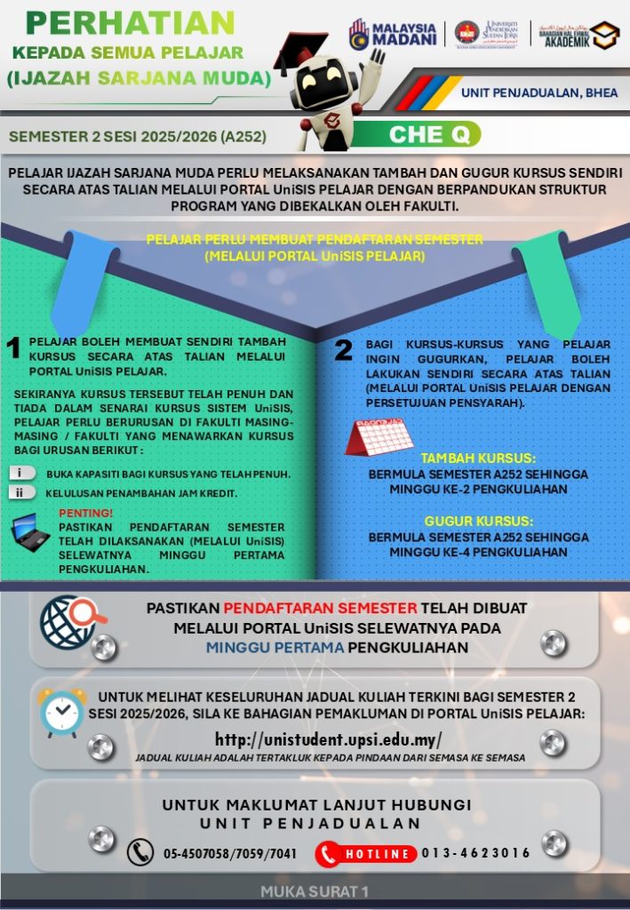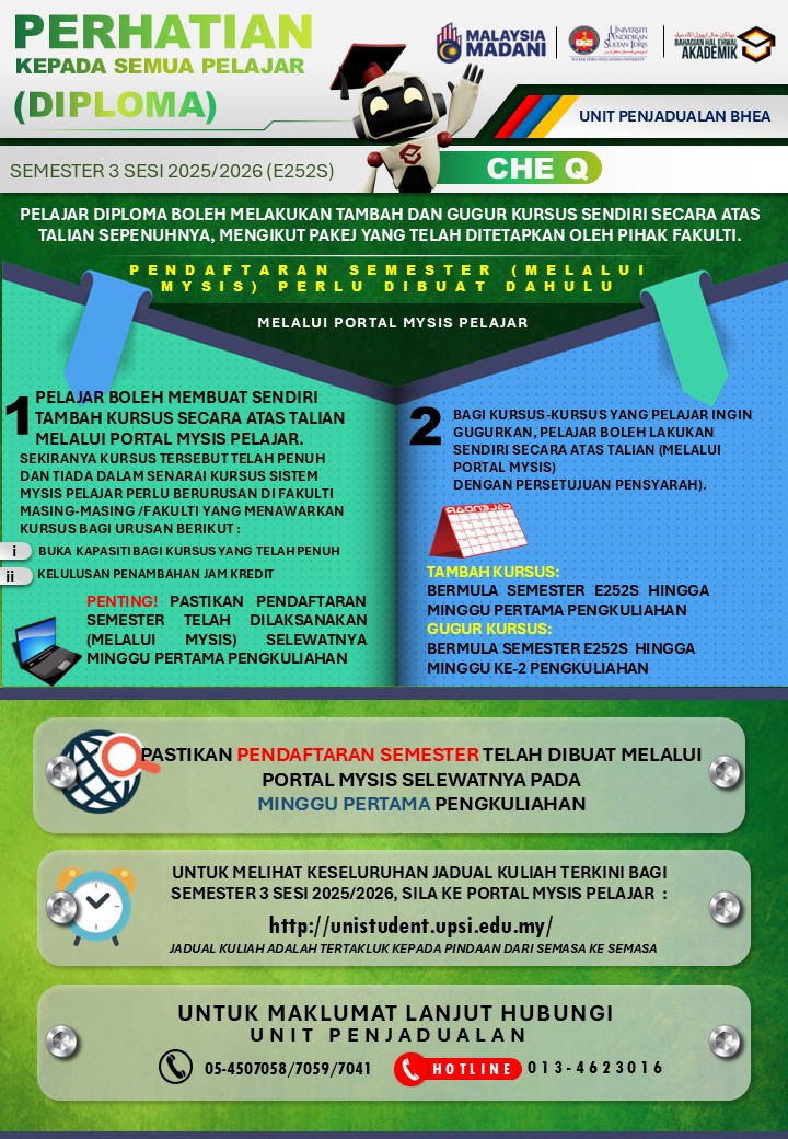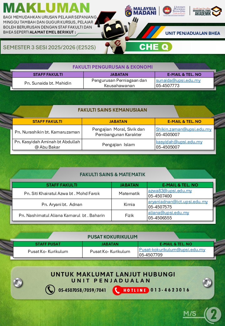 UPSI | Bahagian Hal Ehwal Akademik, 35900 Tanjong Malim, Perak Darul Ridzuan akademik@upsi.edu.my Hotline BHEA : +6013-415 3016 (Kemasukan) / +6013-446 3016 (Pengijazahan & Peperiksaan)) / +6013-462 3016 (Penjadualan)