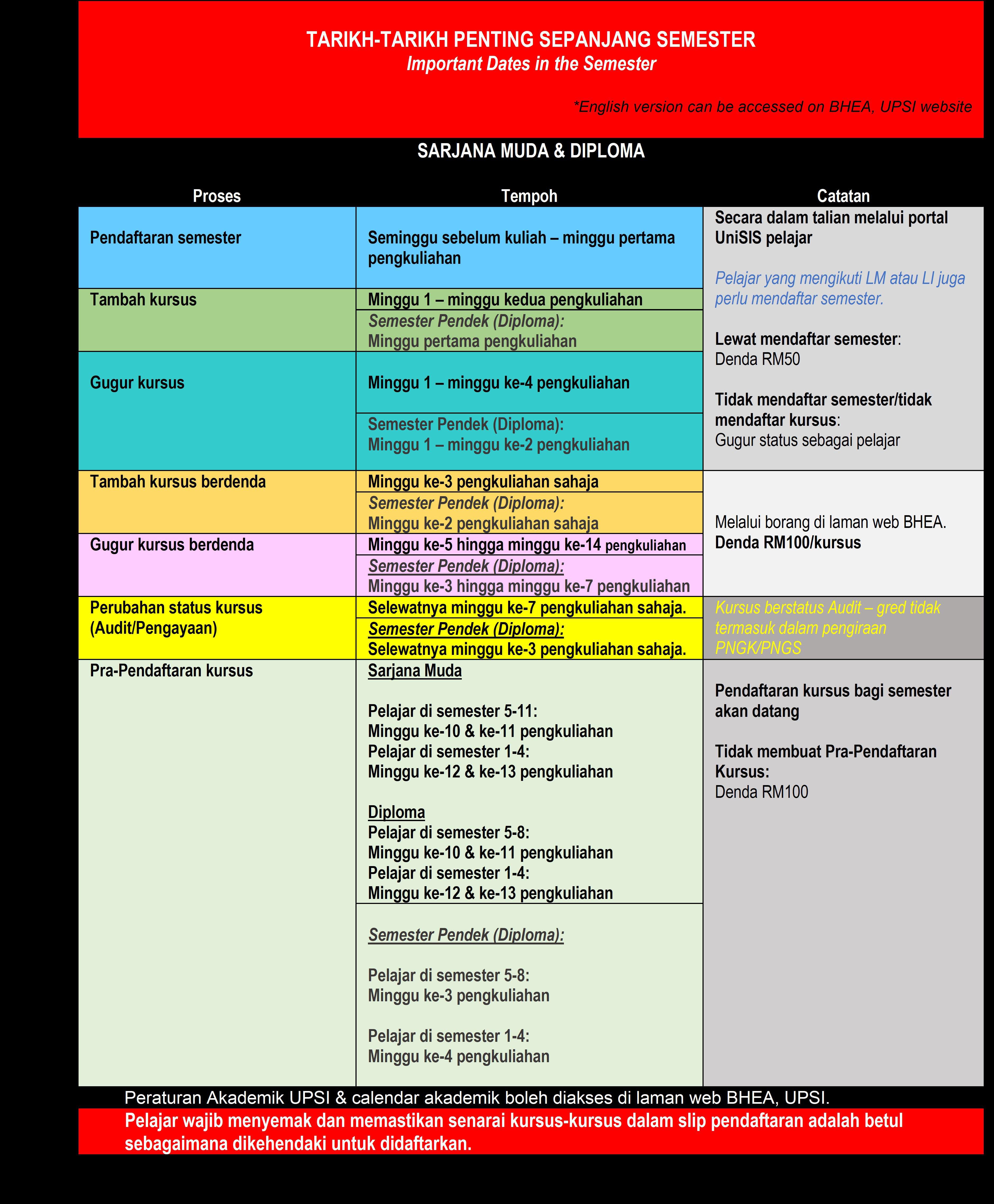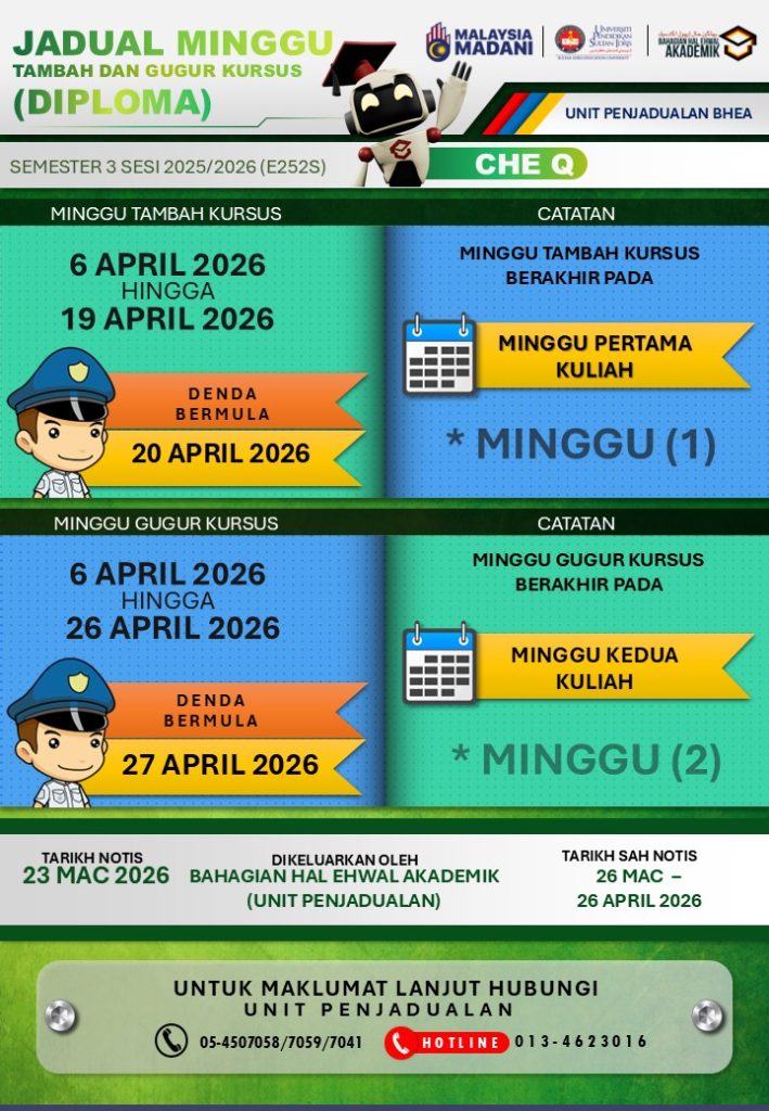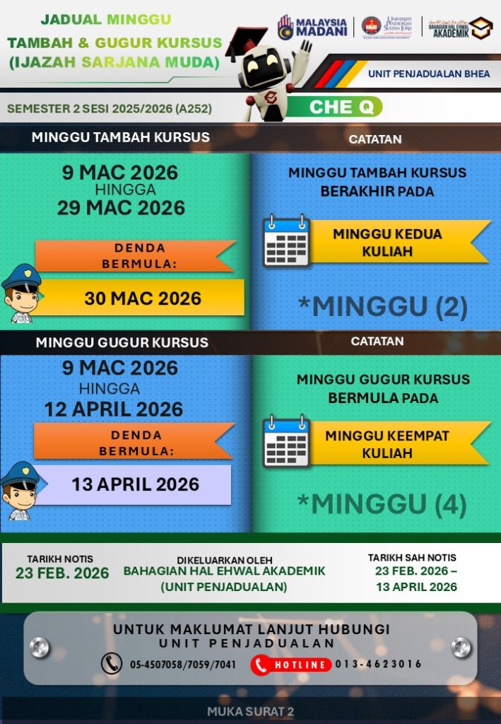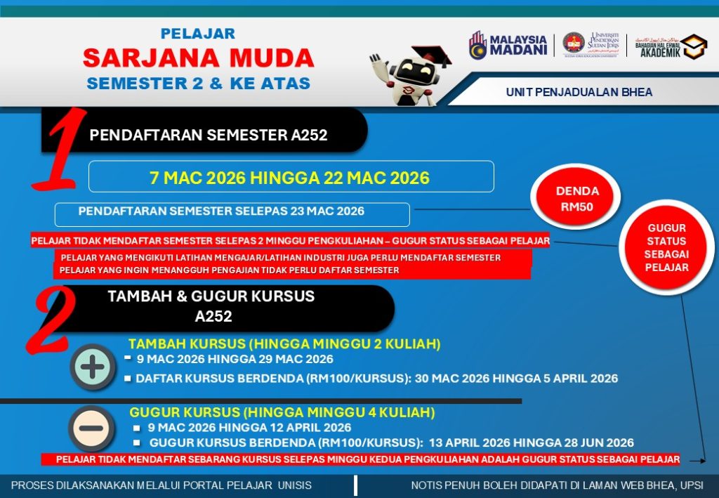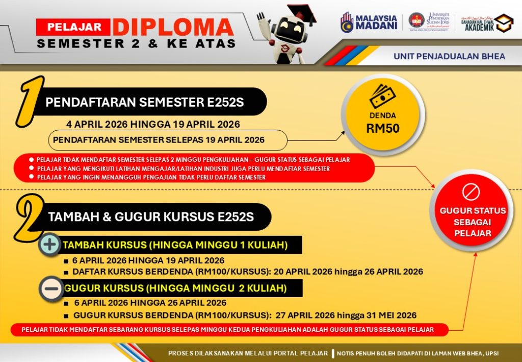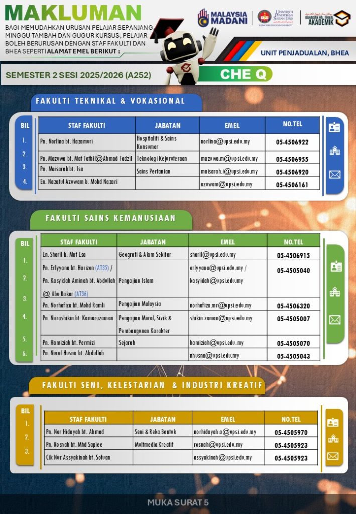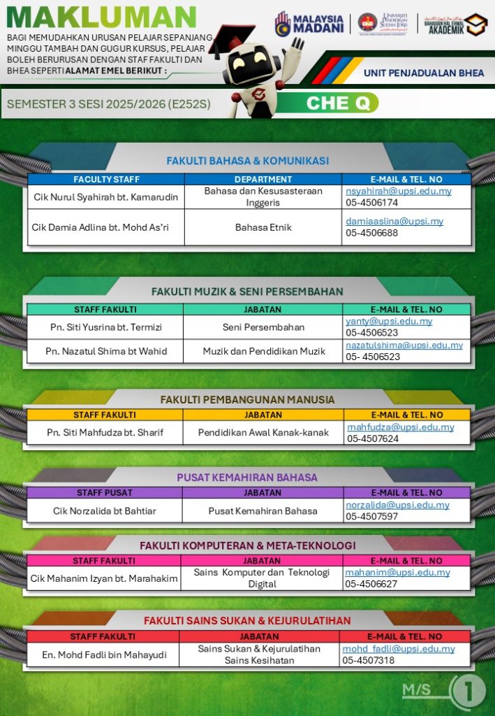 UPSI | Bahagian Hal Ehwal Akademik, 35900 Tanjong Malim, Perak Darul Ridzuan akademik@upsi.edu.my Hotline BHEA : +6013-415 3016 (Kemasukan) / +6013-446 3016 (Pengijazahan & Peperiksaan)) / +6013-462 3016 (Penjadualan)